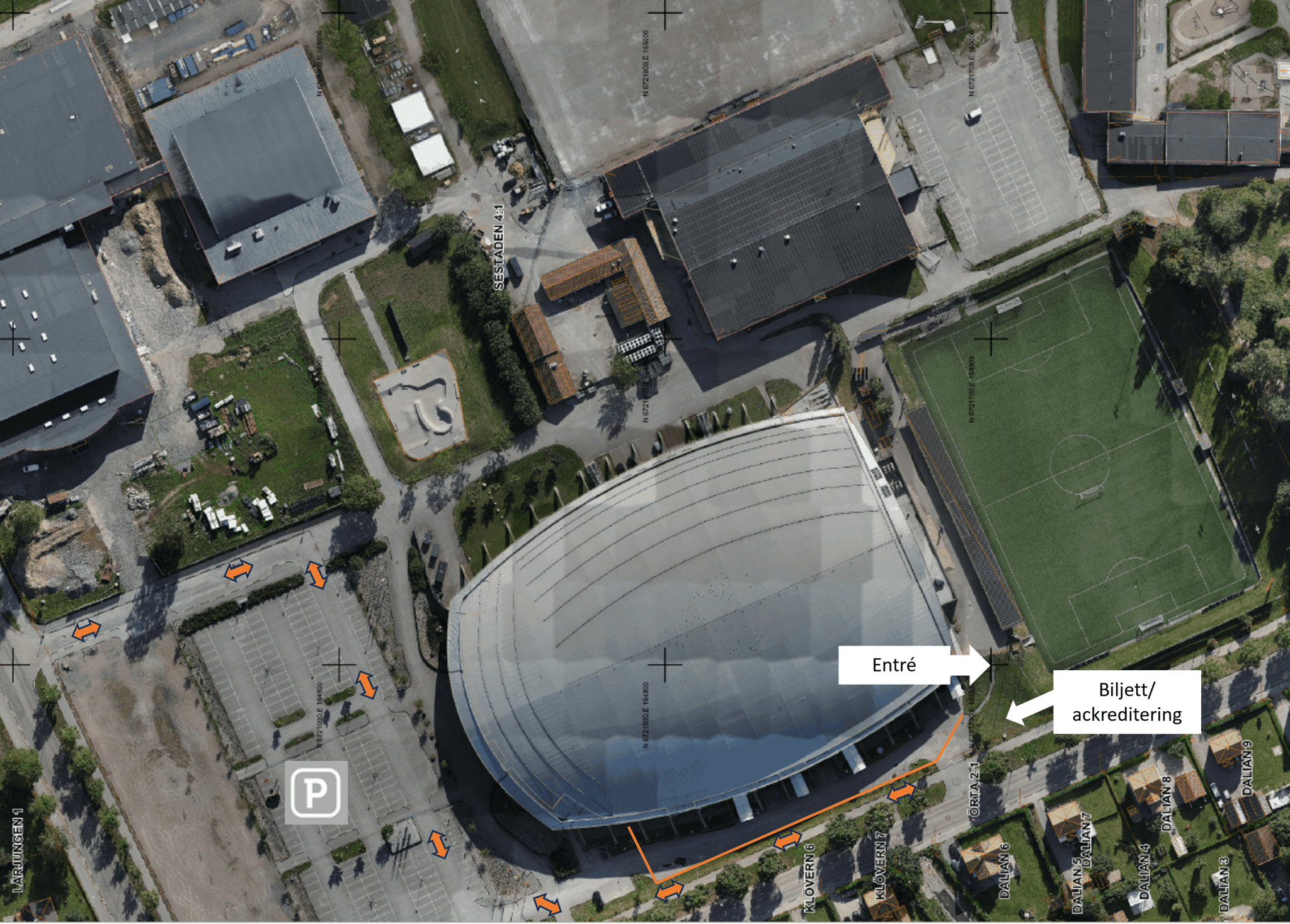 På grund av Nordic Horse Show är tillgången till arenan begränsad innan avspark. Entré, biljettkassa och ackreditering har flyttat till Årsundavägen. Se bilden nedan.