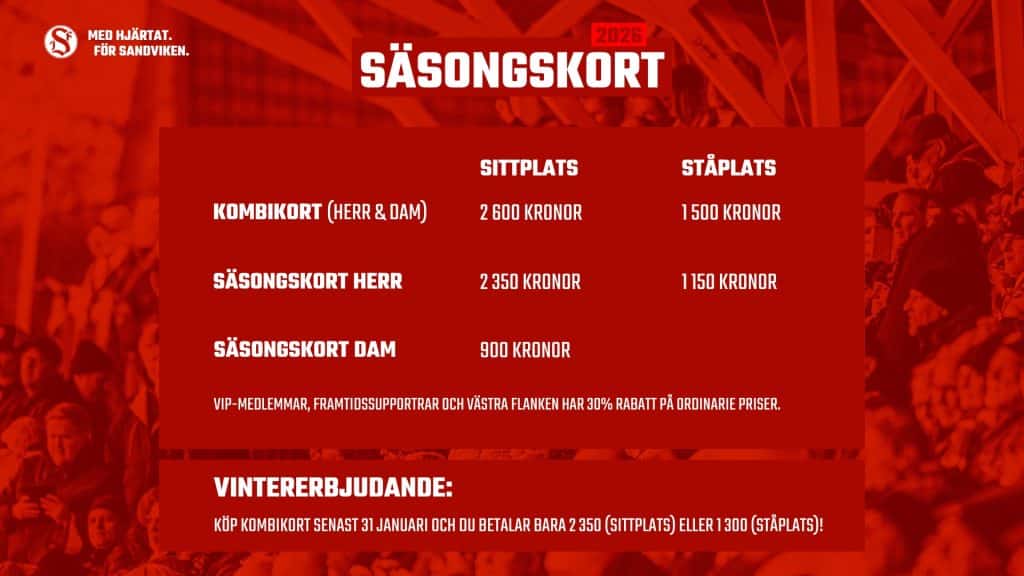 Från och med tisdag 25/11 12:00 kan du köpa säsongskort på sandvikensif.ebiljett.nu