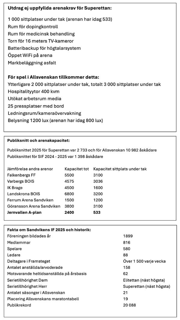 Vi uppmanar därför till skyndsamma beslut som säkerställer elitfotboll i Sandviken från 2027, och att arbetet med en långsiktig, kostnadseffektiv och ändamålsenlig arena vid Jernvallen-området ges högsta prioritet.